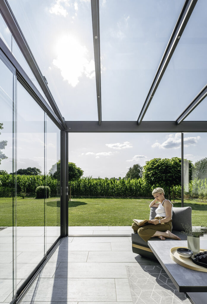 Vertikale Glaselemente machen Deine Überdachung noch vielseitiger. Ob Schiebe-, Falt- oder Drehsysteme: Sie schützen vor Wind und Regen und verwandeln Deine Terrasse bei Bedarf in einen geschlossenen Raum.