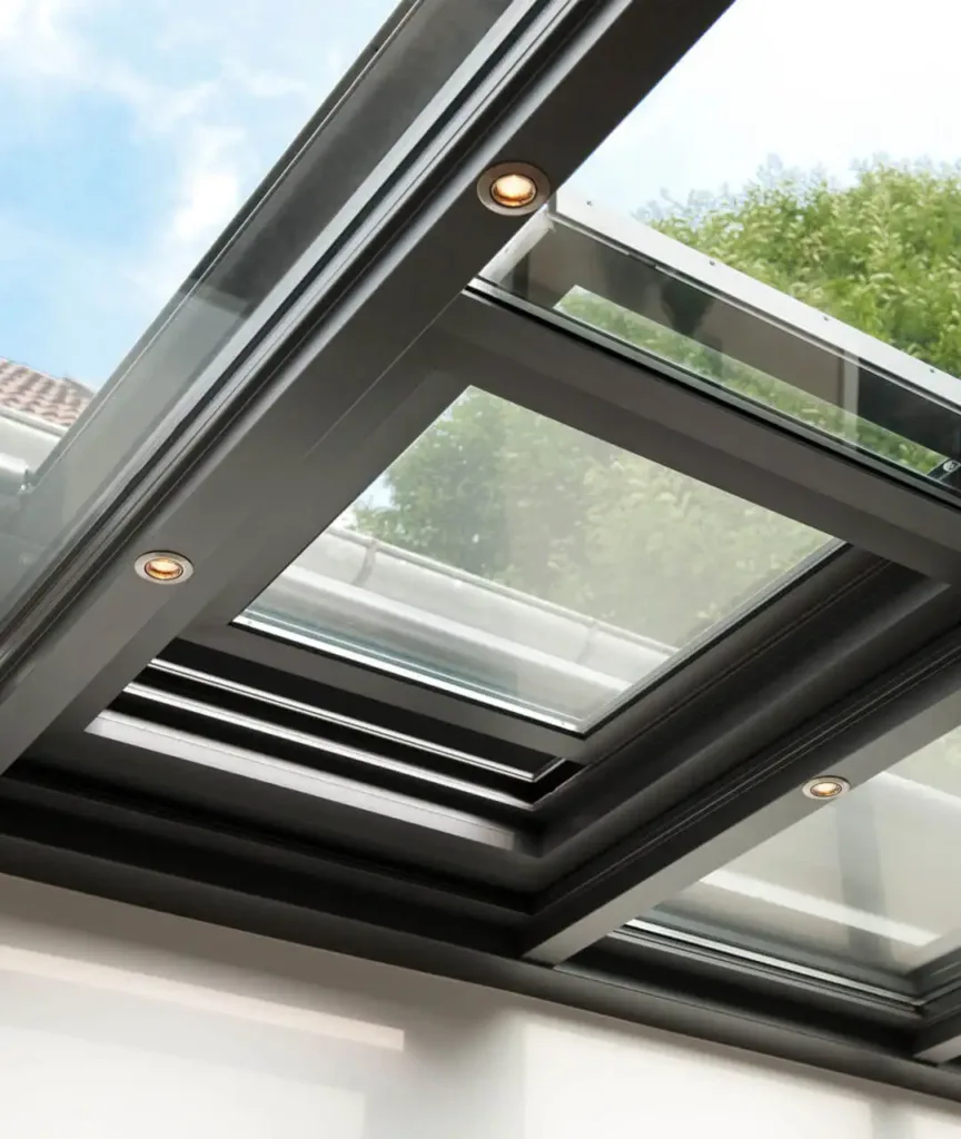 Auf Wunsch können Dachflächenfenster in die Überdachung integriert werden. Sie sorgen für Luftzirkulation und verhindern, dass sich Wärme unter dem Glas staut.